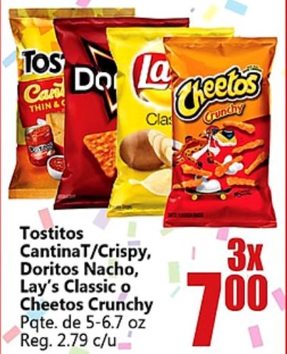 thin& clas crunchy cheetos tostitos cantinat/crispy doritos nacho, lay's classic pqte reg.