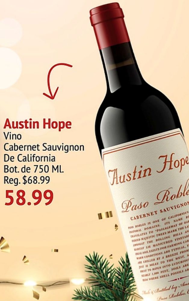 austin hope vino cabernet sauvignon california reg. $austin paso roble bobles california's pitoral domains name mark translates "passageway majestic trees mills wongat hills manicured rolinita sintat maarming deal soil exists conditions chilled breeze from miles west ripen into luxuriou marly feet, soils where shell fossils bottled robles,