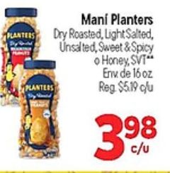 mani planters roasted light salted, unsalted, sweet spicy honey, reg. $c/u