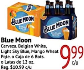 blue moon cerveza belgian white light blue, mango wheat pqte. caja bots. latas reg. $c/u
