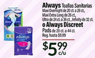 always jiscreet toallas sanitarias maxi overnight extra long ultra ct., infinity discreet pads reg. $$c/u