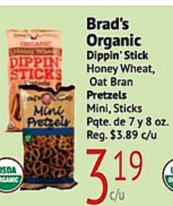 dippin sticks organic brad's dippin' stick honey wheat bran pretzels mini pretzel mini, canic pate reg. $c/u