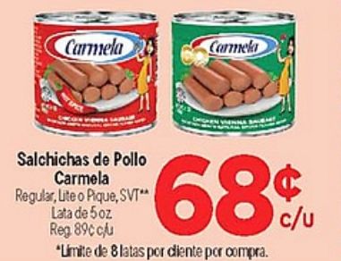 carmela salchichas pollo regular lite pique, lata "limite latas diente compra