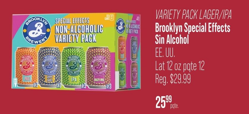 brooklyn special effects non-alcoholic prewery variety pack brok cial pils hoppy amber gookly hazy riety lager/ipa alcohol eeuu. pqte reg. $pqte.