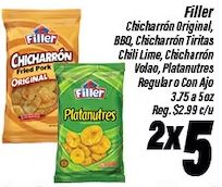 filler chicharron fried pork original chicharrĂ³n bbq, tiritas chili lime, volao, platanutres regularo $c/u