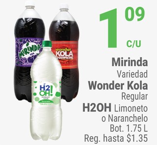 Mirinda Variedad Wonder Kola Regular H2OH Limoneto o Naranchelo Bot. 1.75 L