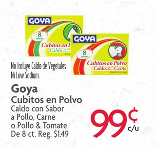 Goya Cubitos en Polvo Caldo con Sabor a Pollo, Carne o Pollo & Tomate De 8 ct. Reg. $1.49