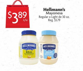 Hellmann's Mayonesa Regular o Light de 30 oz.