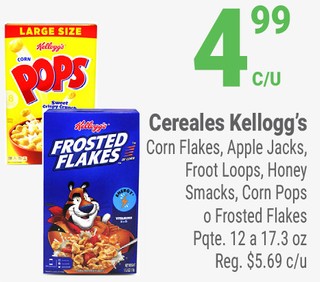 Cereales Kellogg's Corn Flakes, Apple Jacks, Froot Loops, Honey Smacks, Corn Pops o Frosted Flakes Pqte. 12 a 17.3 oz