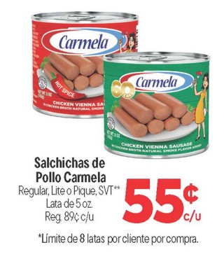Salchichas de Pollo Carmela Regular, Lite o Pique, Lata de 5 oz.