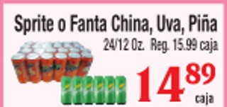 Sprite o Fanta China, Uva, Piña 24/12 Oz. Reg. 15.99 caja