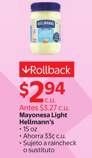 Mayonesa Light Hellmann's 15 oz Ahorra 33¢ c.u. Sujeto a raincheck o sustituto