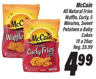mccain natural fries season waffle secsened curly, inutes, sweet potatoes baby cakes curly