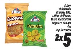 filler chicharro original platanutres chicharrĂ³n bbq, tiritas chili lime, volao, regular $c/u