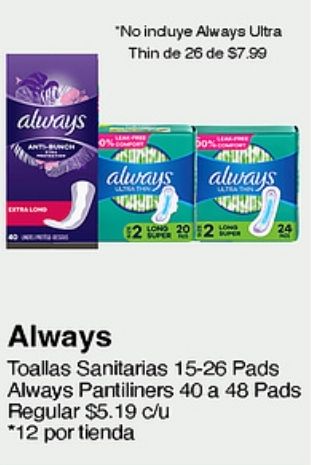 always induye ultra thin super long toallas sanitarias pads pantiliners regular $c/u *por tienda