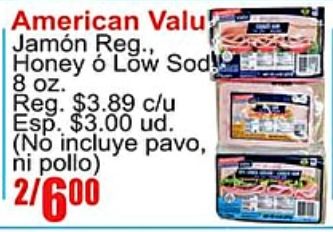 american valu jamón honey reg. $c/u esp. $ud. incluye pavo, pollo)