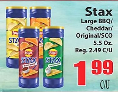 lays stax large bbq/ cheddar/ original/sco reg.