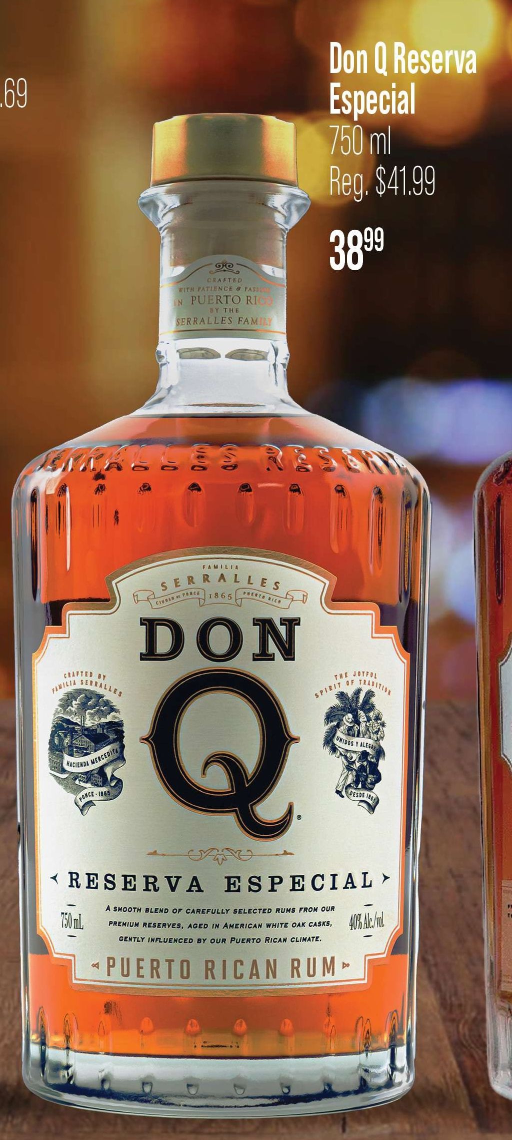 crafted with fatience pass puerto serralles family reserva especial $alles reserv familia hacienda mercedita poncefamilia ciudad porce jotful spirit tradition unidos alegre smooth blend carefully selected rums from premium reserves aged american white casks, gently influenced rican climate. alc./vol.