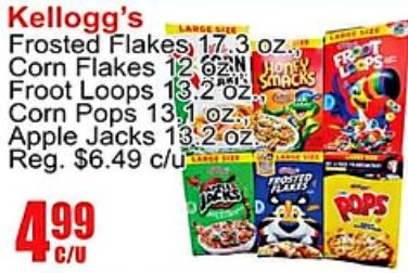 kellogg's frosted flakes corn asmacks froot loops pops apple jacks reg. $c/u plares