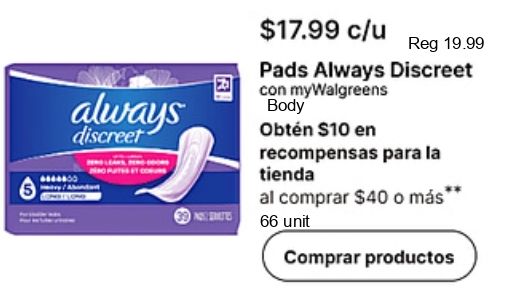 always discreet $c/u pads mywalgreens body obtén recompensas tienda comprar unit productos