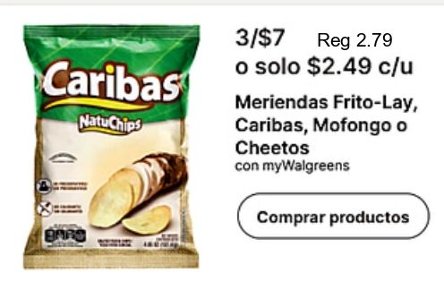 caribas natuchips /$reg $c/u meriendas frito-lay caribas, mofongo cheetos mywalgreens bars comprar productos