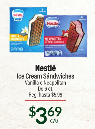 Nestlé Ice Cream Sandwiches Vanilla o Neapolitan De 6 ct.