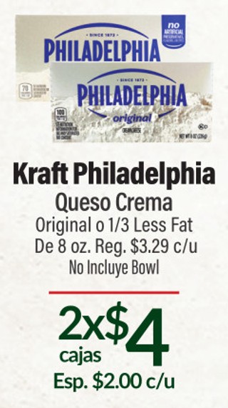 Kraft Philadelphia Queso Crema Original o 1/3 Less Fat.