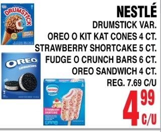 Nestle drumstick var. oreo o kit kat cones 4ct. strawberry shotcake 5 ct. fudge o crunch bars 6 ct. oreo sandwich 4 ct.