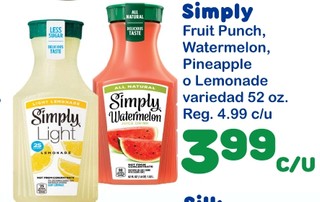 Simply fruit punch, watermelon, pineapple o lemonade variedad 52 oz.
