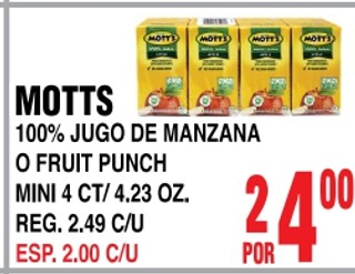 Motts 100% jugo de manzana o fruit punch mini 4 ct. / 4.23 oz.