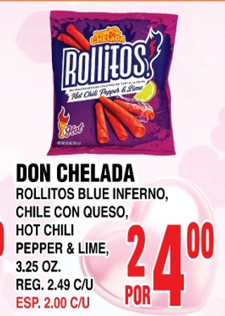 Don Chelada rollitos blue inferno, chile con queso, hot chili pepper & lime, 3.25 oz.