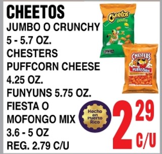 Cheetos jumbo o crunchy 5 - 5.7oz, chesters cheese 4.25oz, funyuns 5.75 oz, fiesta o mofongo mix 3.6 - 5 oz.