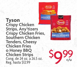 Tyson Crispy Chicken Strips, Any'tizers Crispy Chicken Fries, Southern Chicken Tenders, Cheesy Chicken Fries o Honey BBQ Chicken Strips Cong. de 24 oz. a 26.5 oz.