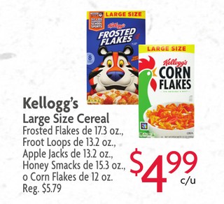 Kellogg's Large Size Cereal Frosted Flakes de 17.3 oz., Froot Loops de 13.2 oz., Apple Jacks de 13.2 oz., Honey Smacks de 15.3 oz., o Corn Flakes de 12 oz.