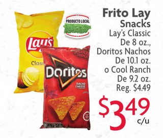 Frito Lay Snacks Lay's Classic De 8 oz., Doritos Nachos De 10.1 oz. o Cool Ranch De 9.2 oz.