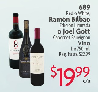 689 Red o White, Ramón Bilbao Edición Limitada o Joel Gott Cabernet Sauvignon Vino De 750 ml.