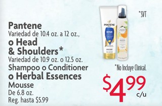 Pantene Variedad de 10.4 oz. a 12 oz., o Head & Shoulders* Variedad de 10.9 oz. o 12.5 oz. Shampoo o Conditioner o Herbal Essences Mousse De 6.8 oz.