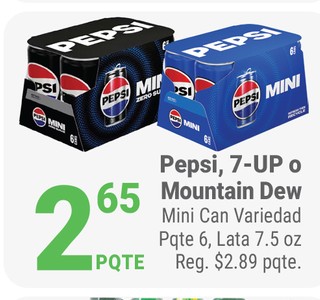 Pepsi, 7-UP o Mountain Dew Mini Can Variedad Pqte 6, Lata 7.5 oz