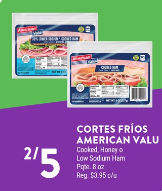 Cortes frios American Valu cooked, honey o low sodium ham pqte. 8 oz.