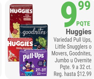 Huggies Variedad Pull Ups, Little Snugglers o Movers, Goodnites, Jumbo u Overnite Pqte. 9 a 32 ct.
