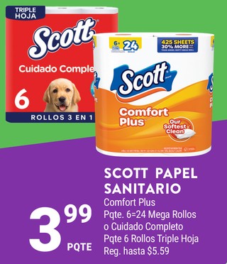 SCOTT PAPEL SANITARIO Comfort Plus Pqte. 6-24 Mega Rollos o Cuidado Completo Pqte 6 Rollos Triple Hoja.
