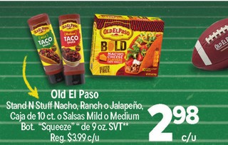 Old El Paso Stand N Stuff Nacho, Ranch o Jalapeño, Caja de 10 ct. o Salsas Mild o Medium Bot. "Squeeze" "de 9 oz. SVT**.