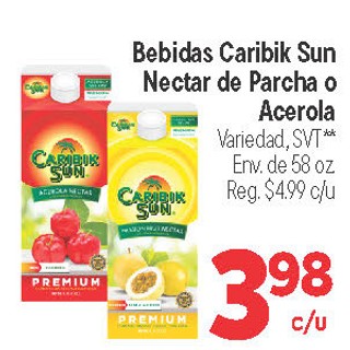 Bebidas Caribik Sun Nectar de Parcha o Acerola Variedad, svt** env. de 58 oz.