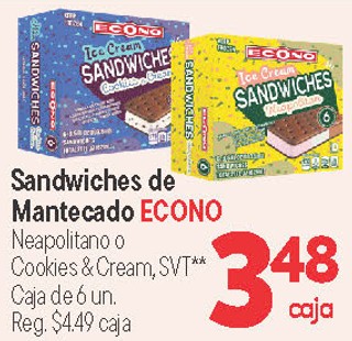 Sandwich de Mantecado ECONO Neapolitano o Cookies & Cream, SVT** Caja de 6 un.