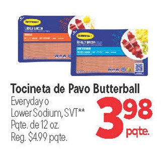 Tocineta de Pavo Butterball Everyday o Lower Sodium, SVT** Pqte. de 12 oz.