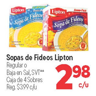 Sopas de fideos lipton regular o baja en sal, svt** caja de 4 sobres