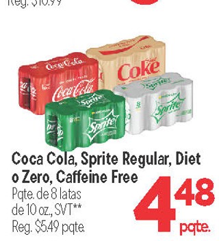 Coca cola, sprite regular, diet o zero, caffeine free pqte. de 8 latas de 10 oz., svt**