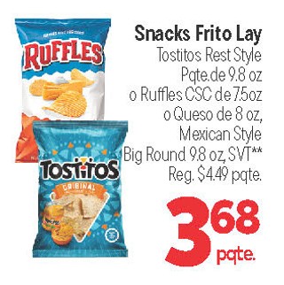 Snacks Frito Lay Tostitos Rest Style Pqte.de 9.8 oz o Ruffles CSC de 7.5oz o Queso de 8 oz, Mexican Style Big Round 9.8 oz, SVT**