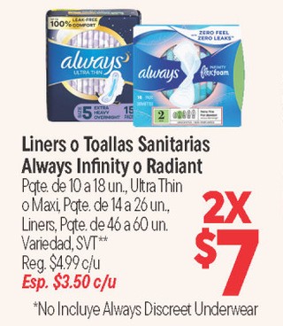 Liners o Toallas Sanitarias Always Infinity o Radiant Pqte. de 10 a 18 un., Ultra Thin o Maxi, Pqte. de 14 a 26 un., Liners, Pqte. de 46 a 60 un. Variedad. SVT*.