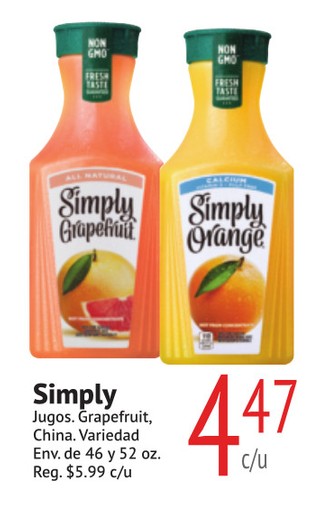 Simply Jugos. Grapefruit, China. Variedad Env. de 46 y 52 oz..
